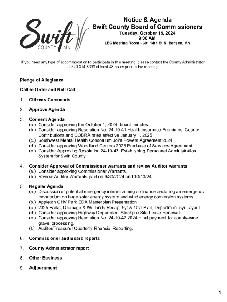 This document outlines the agenda for a Swift County Board of Commissioners meeting, including items for discussion, resolutions, and approvals related to county governance and services.
