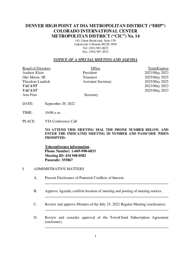 Get the free Notice of a Special Meeting and Agenda