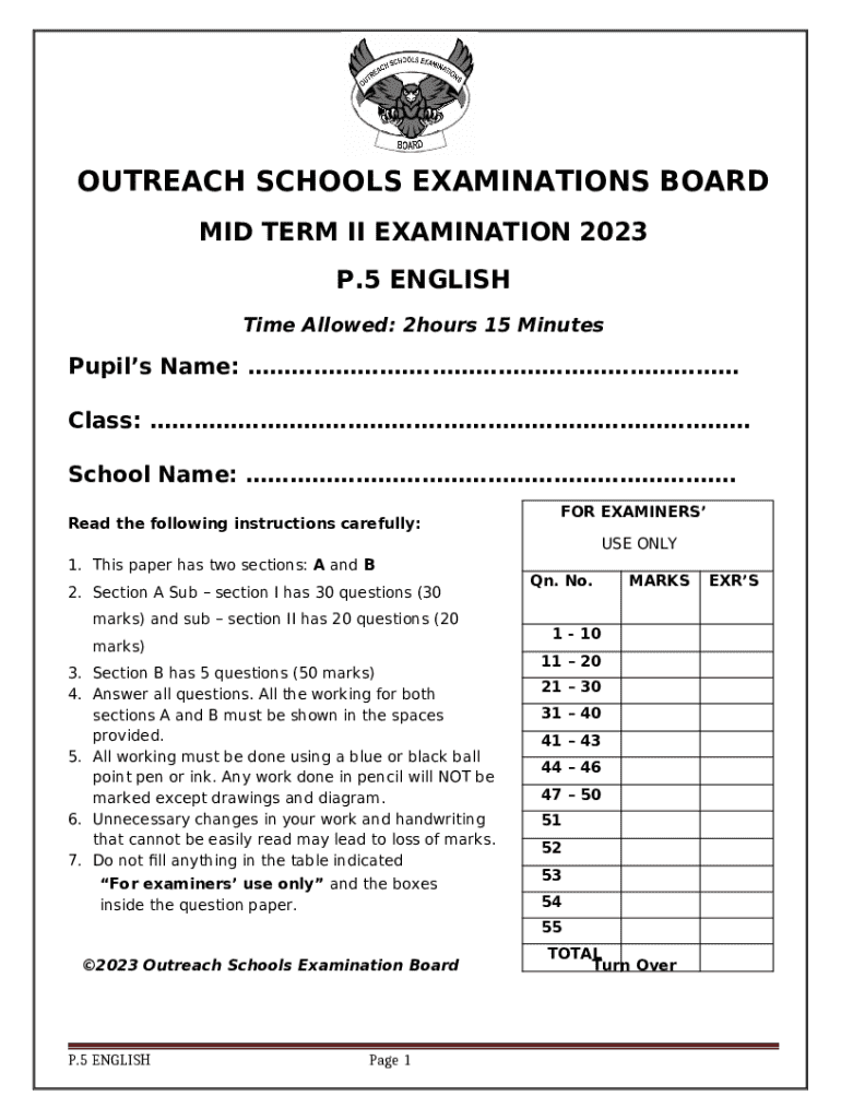 What is P.5 English Mid Term Ii Examination 2023 Form?