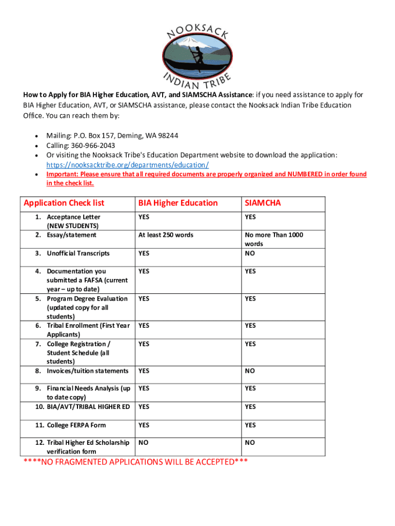 Gather required documents, such as proof of tribal enrollment, transcripts, and financial information.