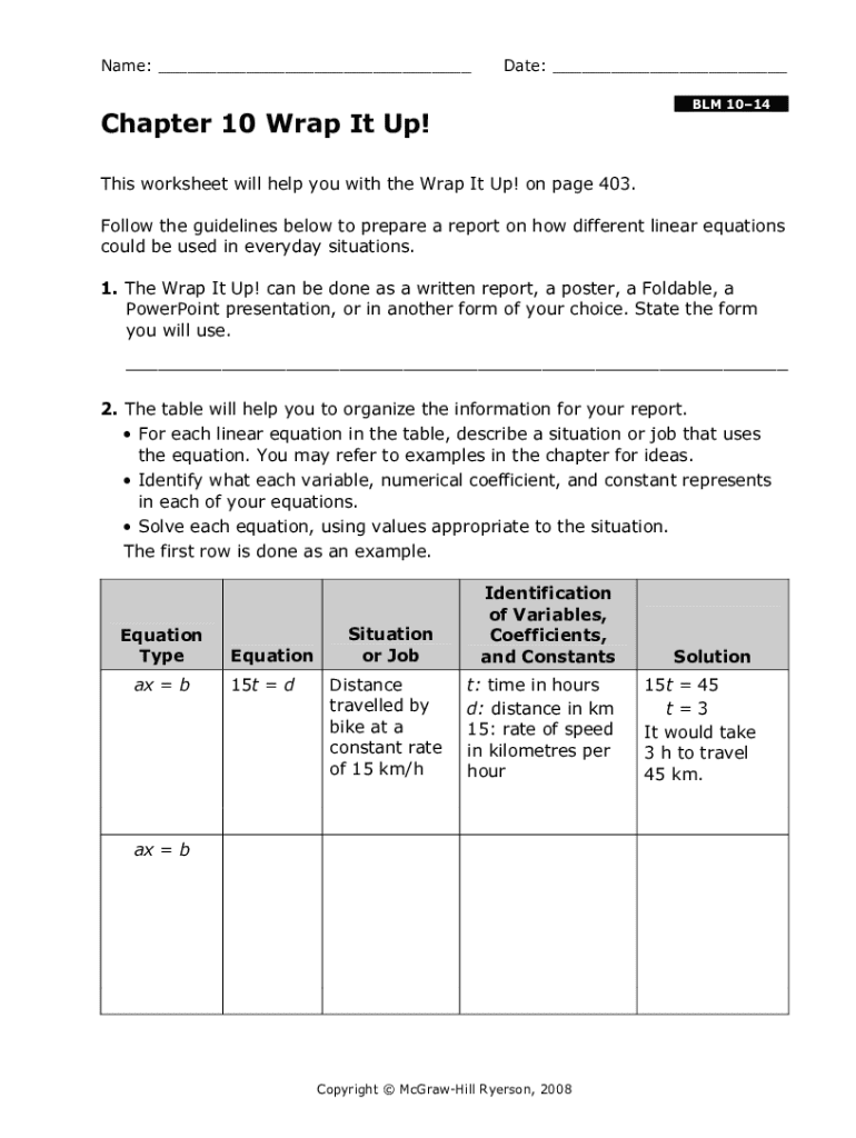 This worksheet assists students in preparing a report on the application of linear equations in everyday situations, including organizing information, identifying variables, and solving equations.