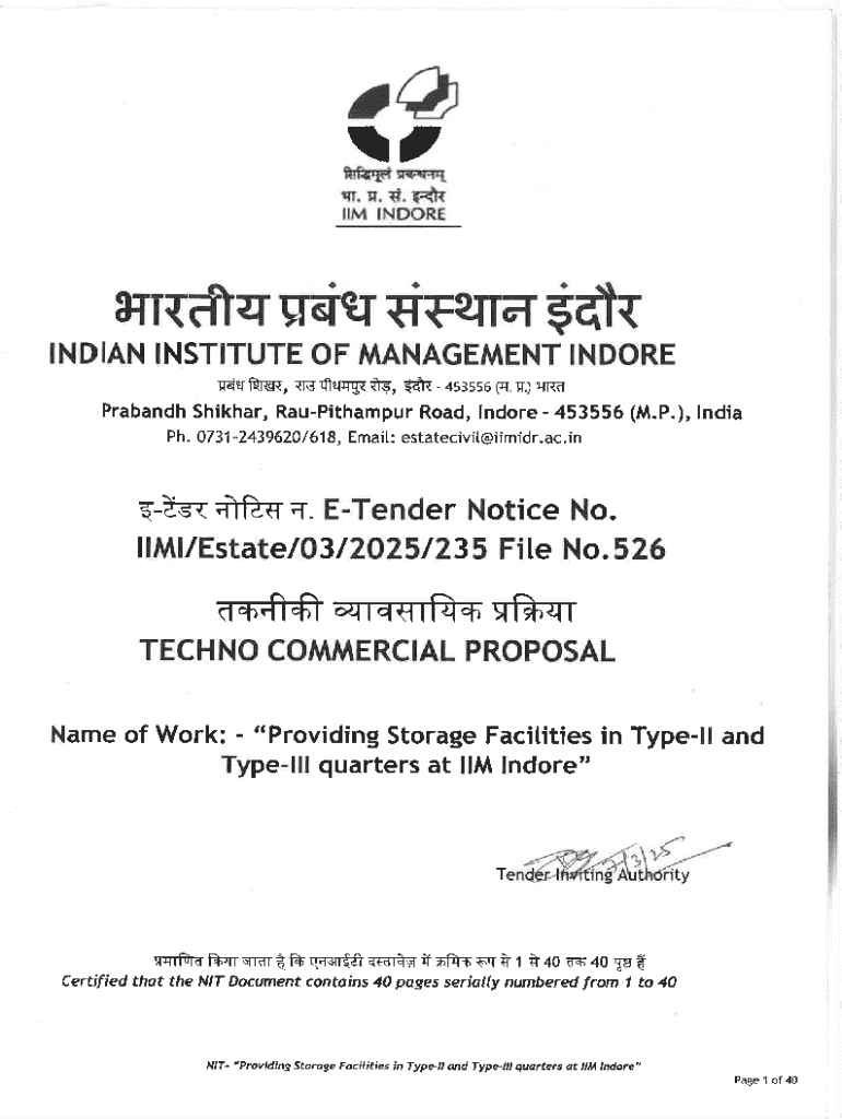 This document invites online tenders for the construction and provision of storage facilities at the Indian Institute of Management Indore, detailing eligibility criteria, payment terms, and bidding