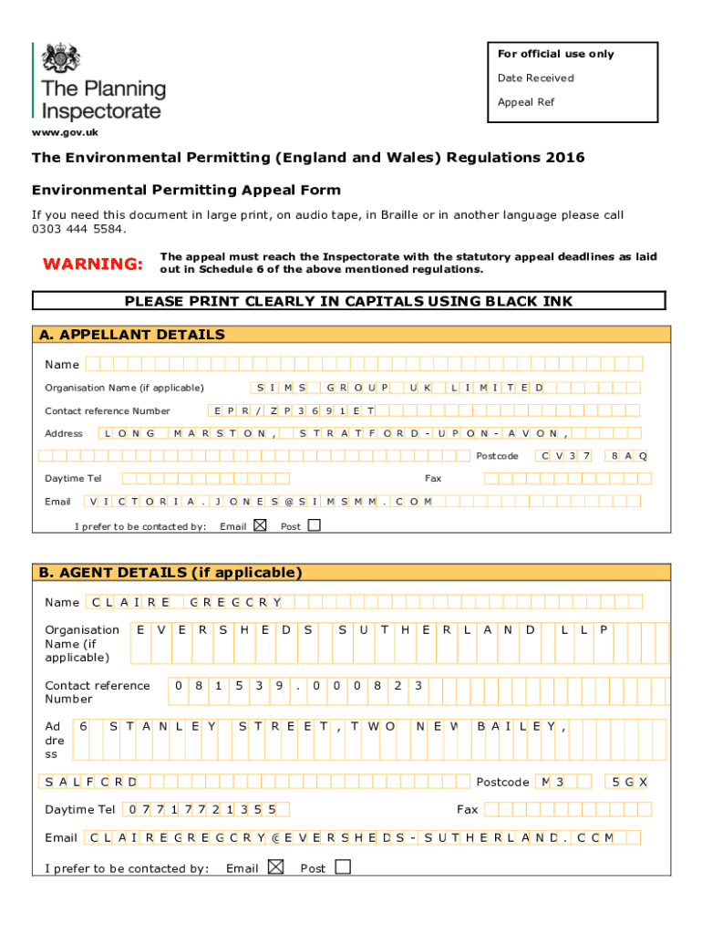 Get the free Environmental Permitting Appeal Form