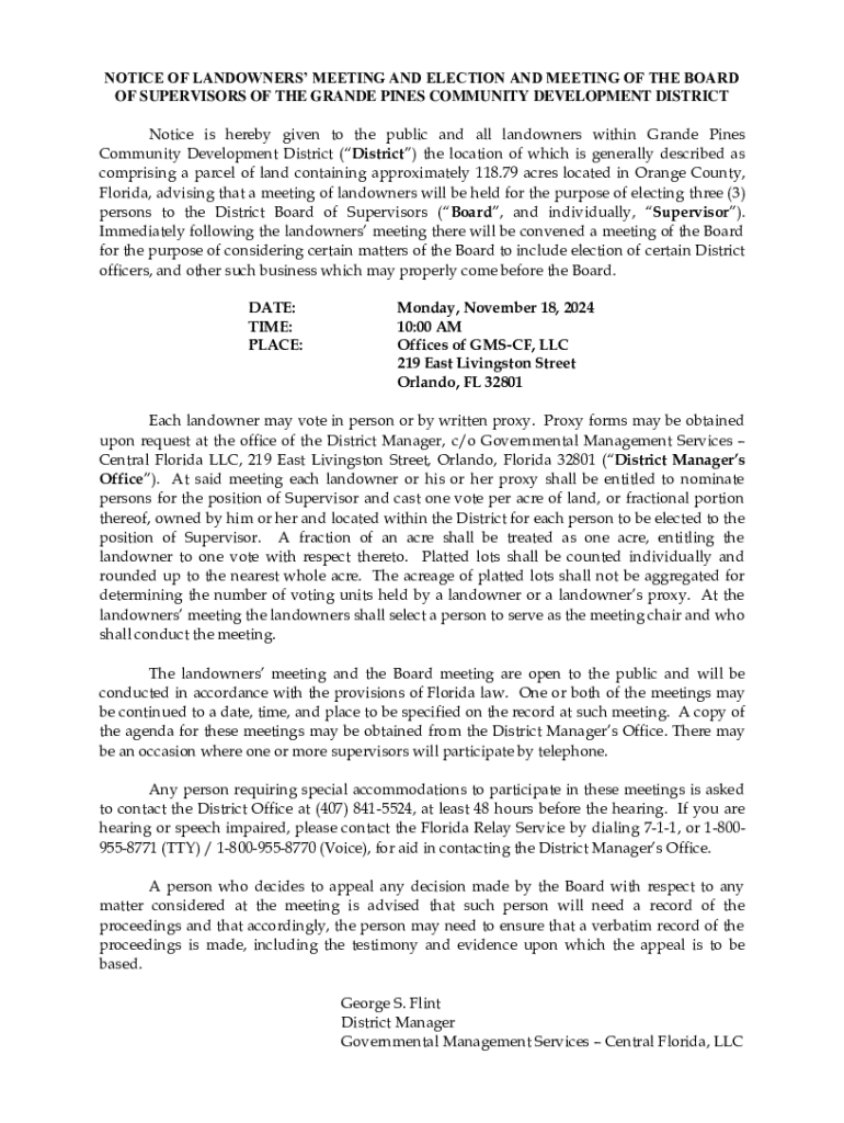This document provides notice of a meeting for landowners of the Grande Pines Community Development District, including details regarding the election of Board Supervisors and guidelines for landowners