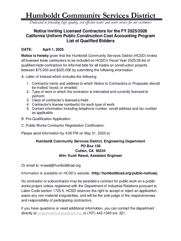 This document serves as an official notice for licensed contractors to apply for inclusion on the Humboldt Community Services District\'s list of qualified bidders for upcoming construction projects.