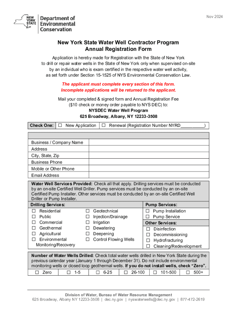 This document is for the registration of water well contractors in New York, facilitating compliance with state environmental laws concerning water well drilling and pump services.