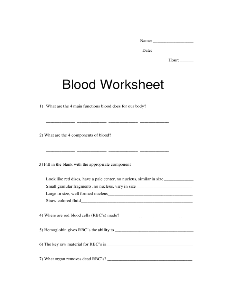 This worksheet is designed to test knowledge about the functions and components of blood, including red blood cells, white blood cells, and platelets.