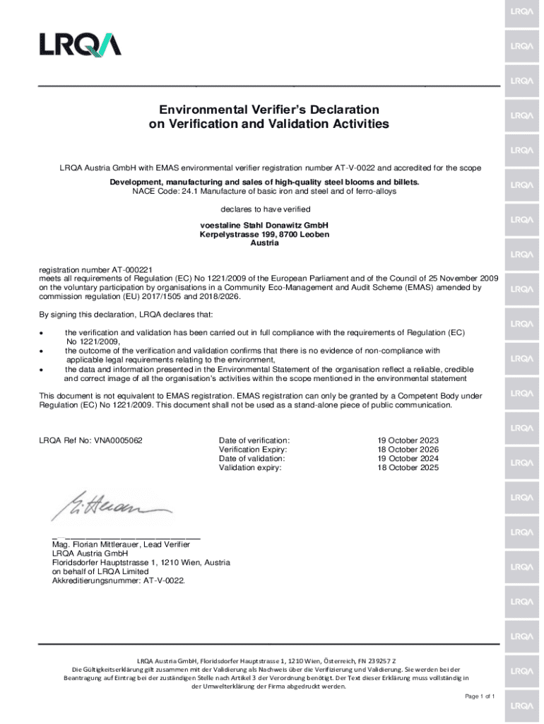Get the free Environmental Verifier’s Declaration on Verification and Validation Activities