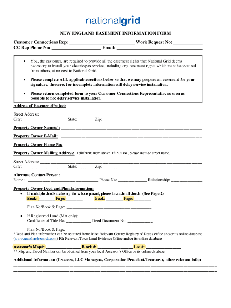 This form requires customers to provide easement rights necessary for the installation of electric/gas service by National Grid.