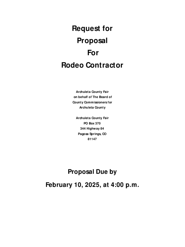 This document is a Request for Proposal (RFP) from Archuleta County for a Rodeo Contractor to manage rodeo events at the annual Archuleta County Fair.