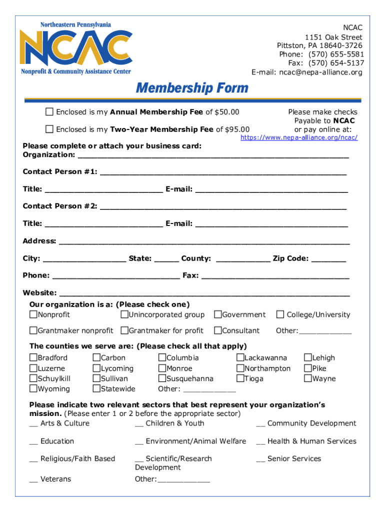 This form is used for registering membership with NCAC and includes payment options, organization details, and service areas.