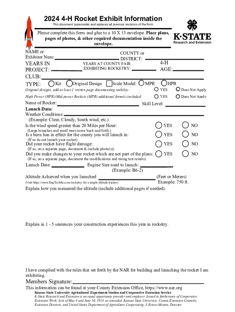 The 2024 4-H Rocket Exhibit Form is an essential document for every participant wishing to enter their project into the exhibit. This form captures important information about your rocket project, ensuring it meets all exhibit criteria.