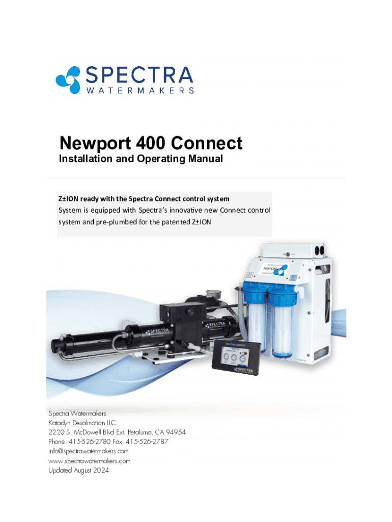 This document provides installation and operation instructions for the Newport 400 watermaker system, detailing setup procedures, maintenance, troubleshooting, and technical specifications.