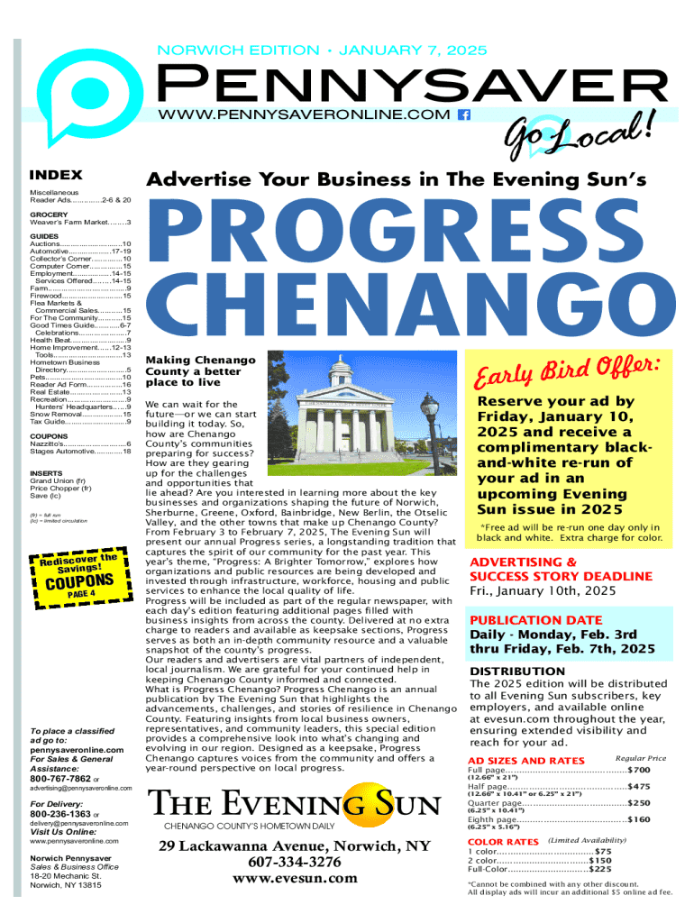 Individuals and businesses wishing to advertise their goods, services, or events are generally required to submit their advertisements to be included in the Norwich Pennysaver January 7 edition.