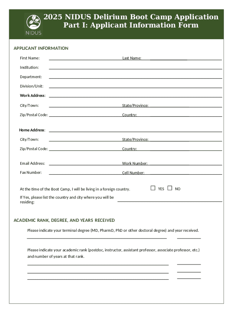 How should you fill out the Nidus Delirium Boot Camp Application template