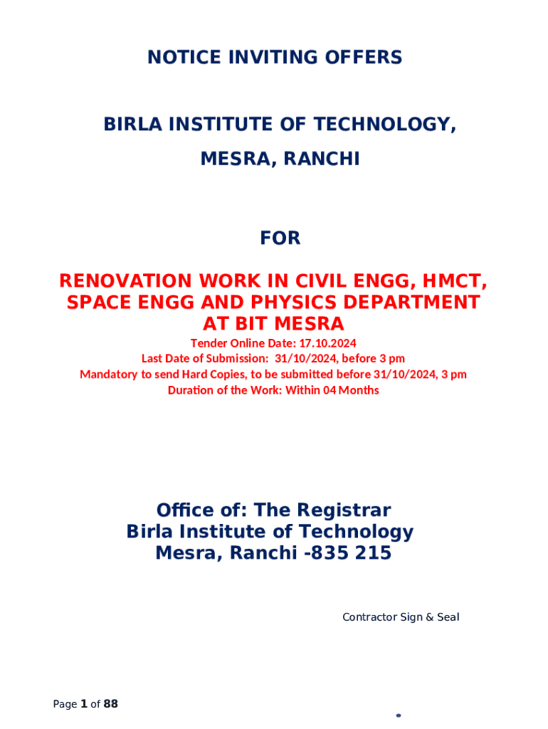 The Notice Inviting Offers is a writable document that should be submitted to the specific address to provide specific information. It needs to be filled-out and signed, which may be done in hard copy, or by using a particular solution e. g. PDFfiller. It lets you complete any PDF or Word document directly from your browser (no software requred), customize it according to your needs and put a legally-binding e-signature. Right away after completion, the user can send the Notice Inviting Offers to the relevant person, or multiple individuals via email or fax. The blank is printable too because of PDFfiller feature and options presented for printing out adjustment. Both in electronic and in hard copy, your form will have a organized and professional appearance. Also you can save it as the template to use it later, so you don't need to create a new document again. All you need to do is to edit the ready template.