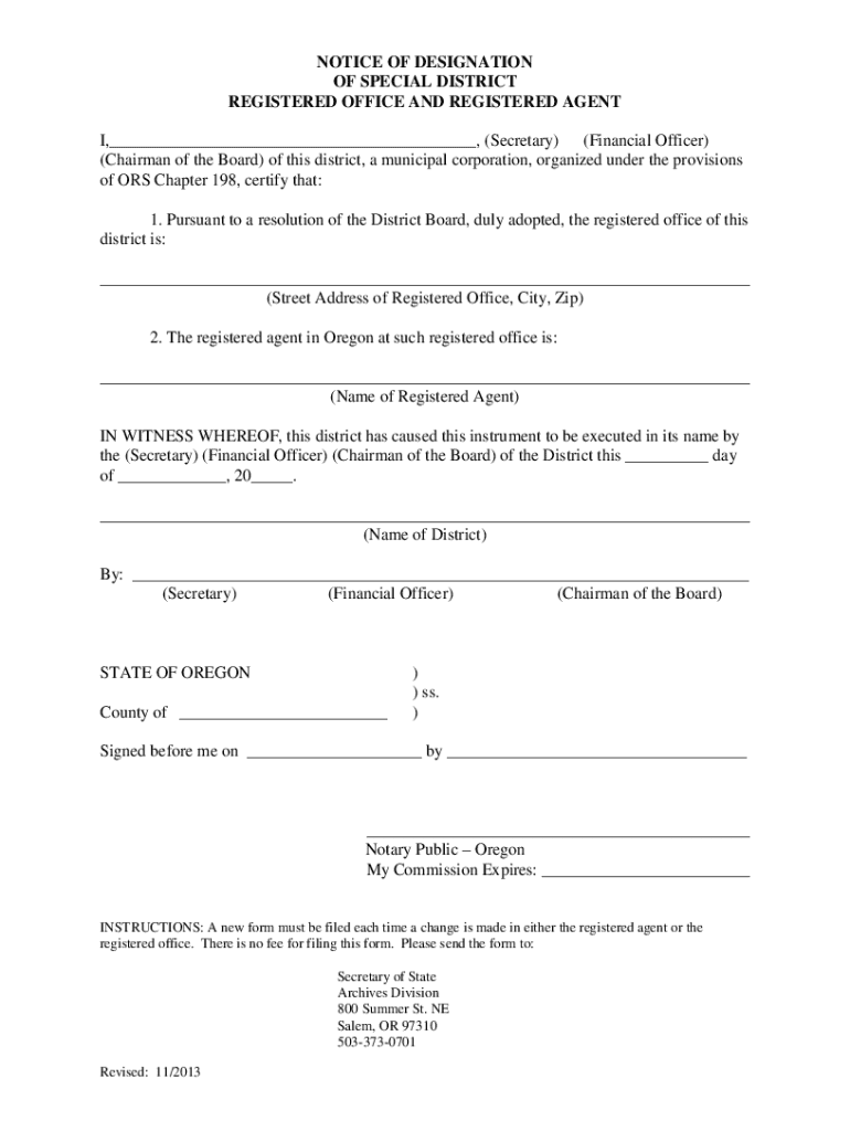 Get the free Notice of Designation of Special District Registered Office and Registered Agent