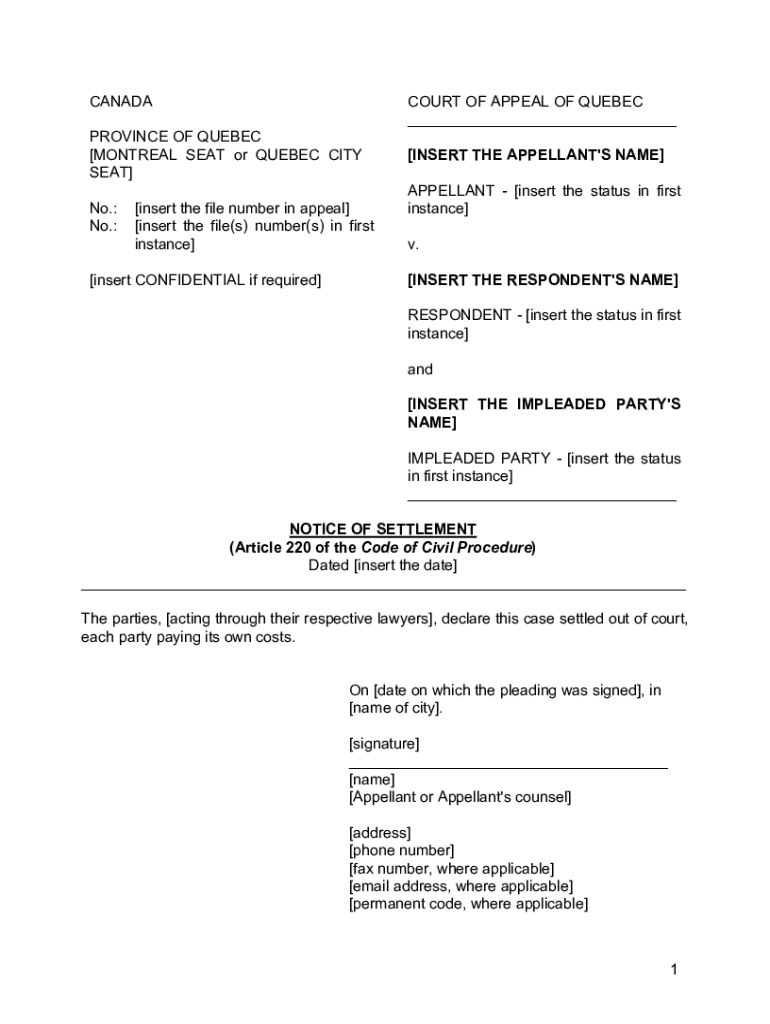 Get the free Notice of Settlement