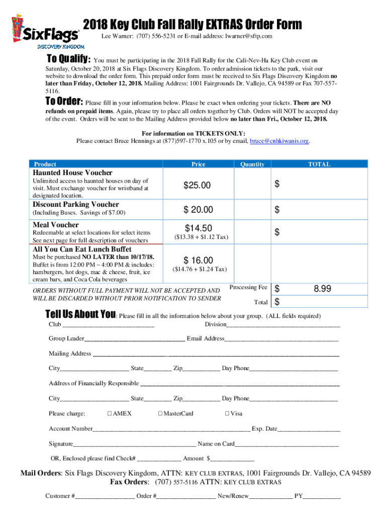 This document serves as an order form for admission tickets and various vouchers for the 2018 Fall Rally event held by the Key Club at Six Flags Discovery Kingdom.