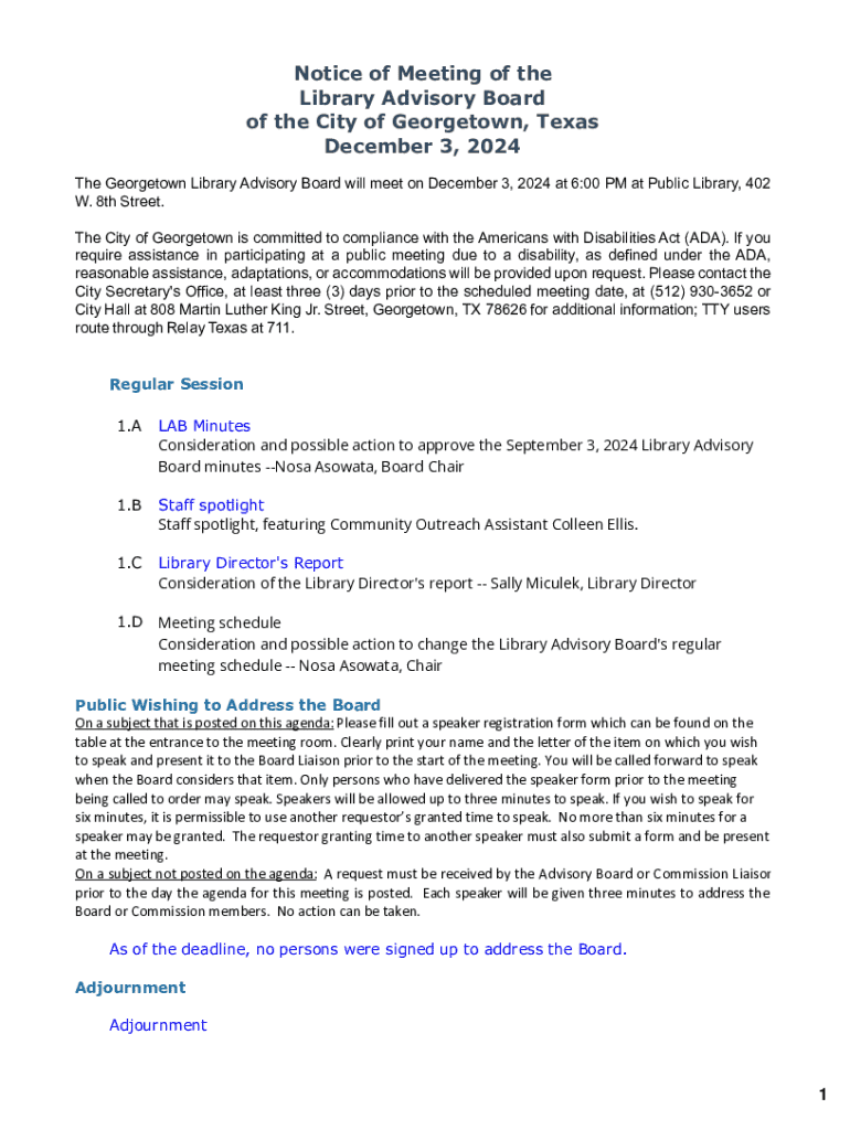 Get the free Notice of Meeting of the Library Advisory Board of the City of Georgetown, Texas - d...