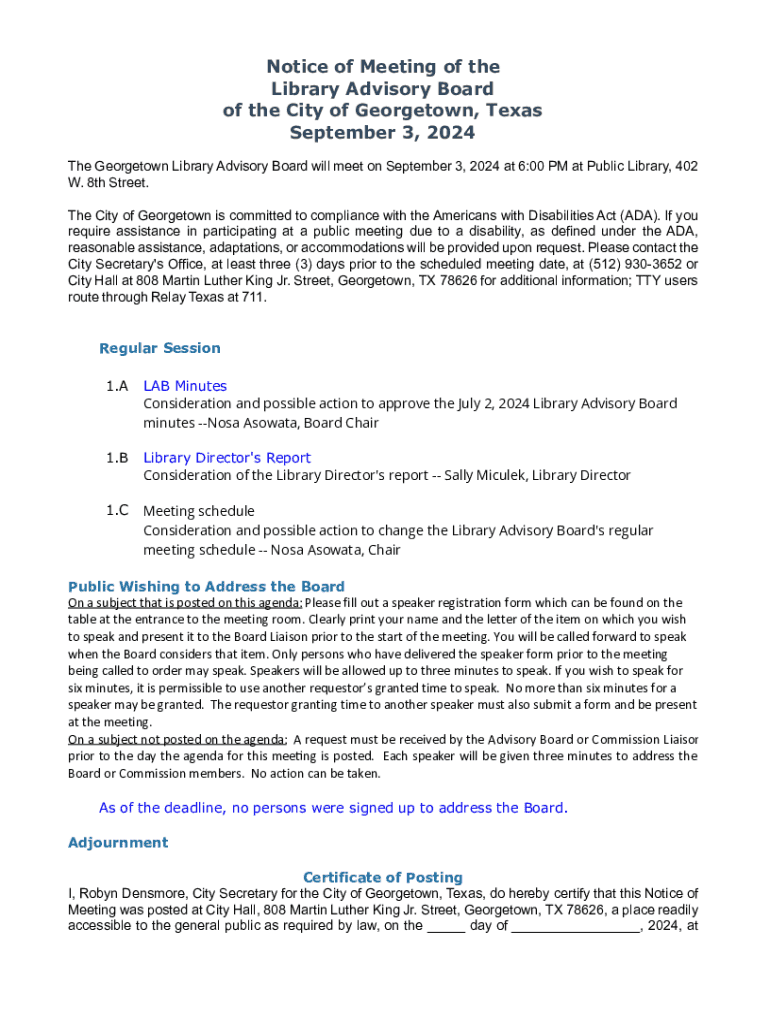 Get the free Notice of Meeting of the Library Advisory Board