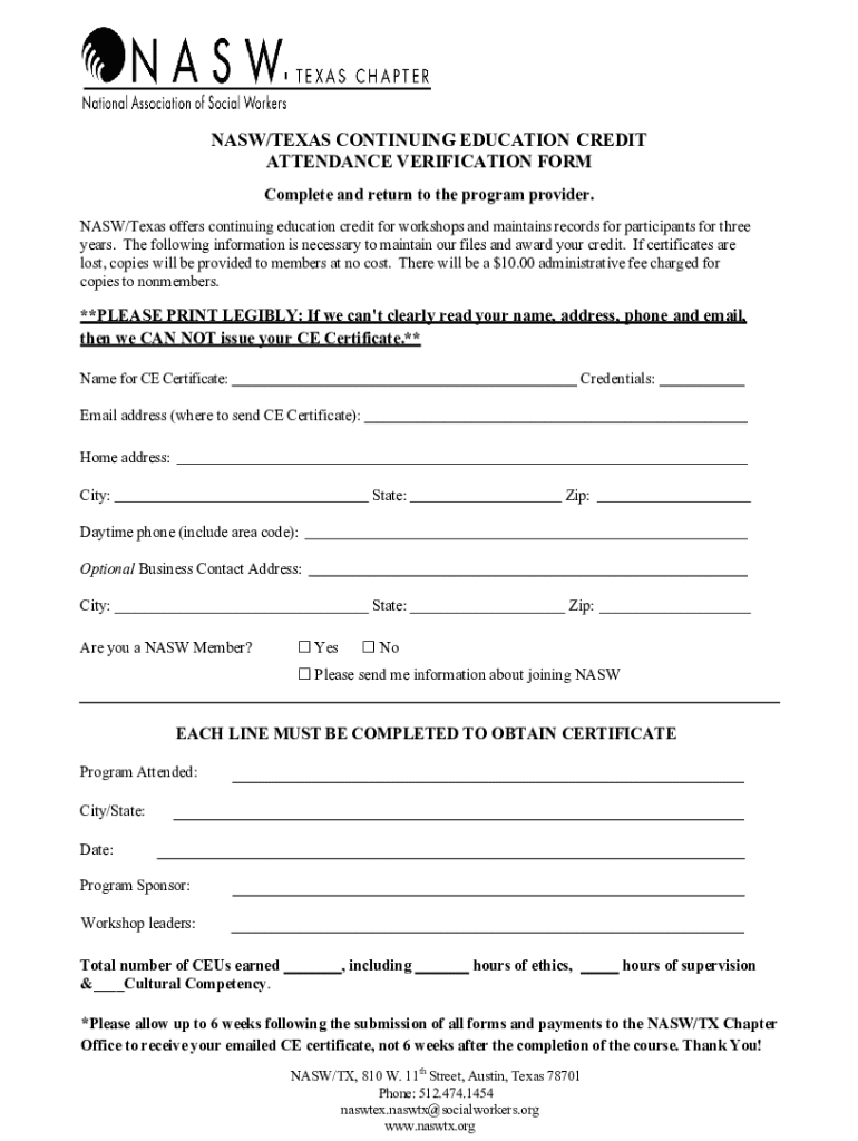 Get the free Nasw/texas Continuing Education Credit Attendance Verification Form