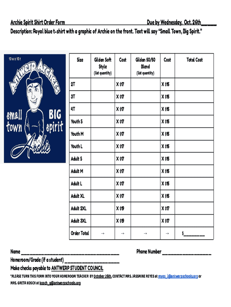 Get the free Archie Spirit Shirt Order Form
