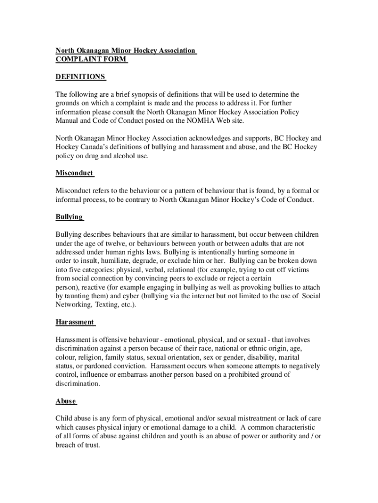 Get the free North Okanagan Minor Hockey Association Complaint Form