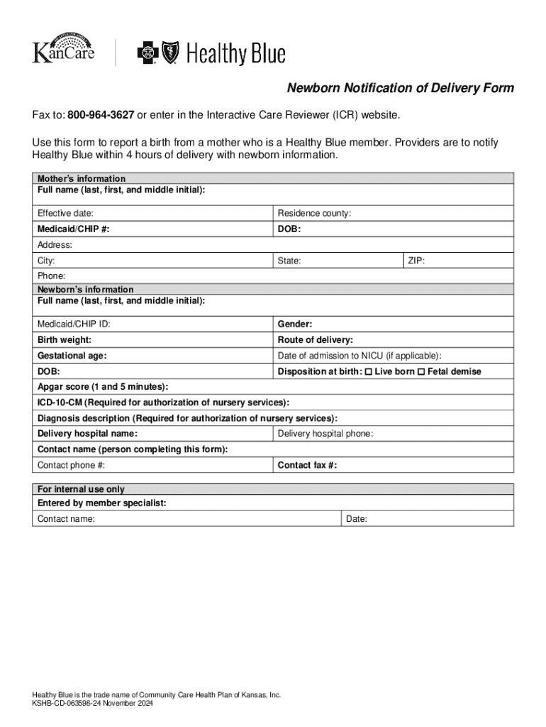 This form is used to report a birth for a mother who is a Healthy Blue member and must be submitted within 4 hours of delivery, containing both mother\'s and newborn\'s information.