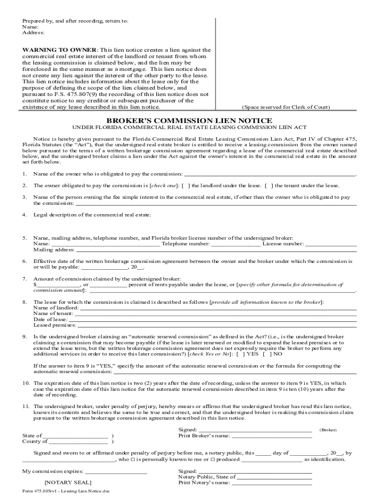 Get the free Broker’s Commission Lien Notice Under Florida Commercial Real Estate Leasing Commiss...