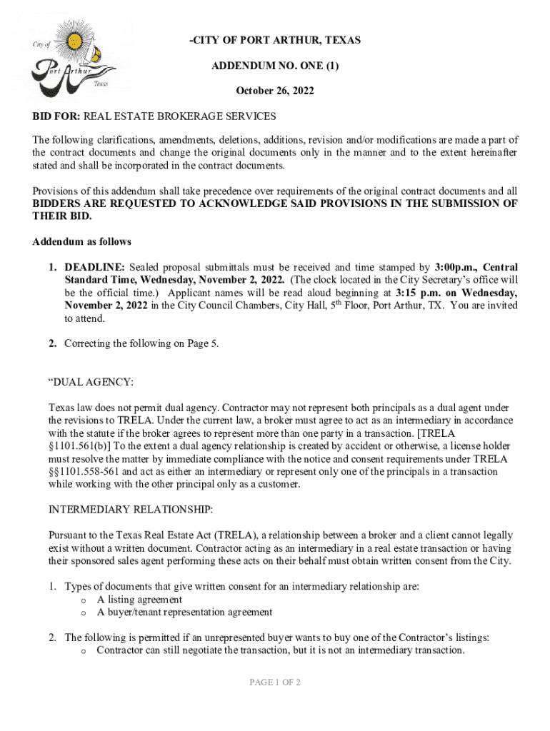 This document provides clarifications and modifications to the bid for real estate brokerage services, detailing the submission deadline and legal requirements for agency representation under Texas