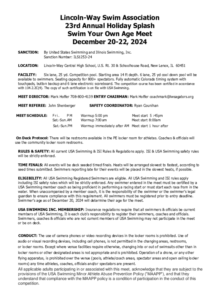 Get the free Lincoln-way Swim Association 23rd Annual Holiday Splash Swim Your Own Age Meet