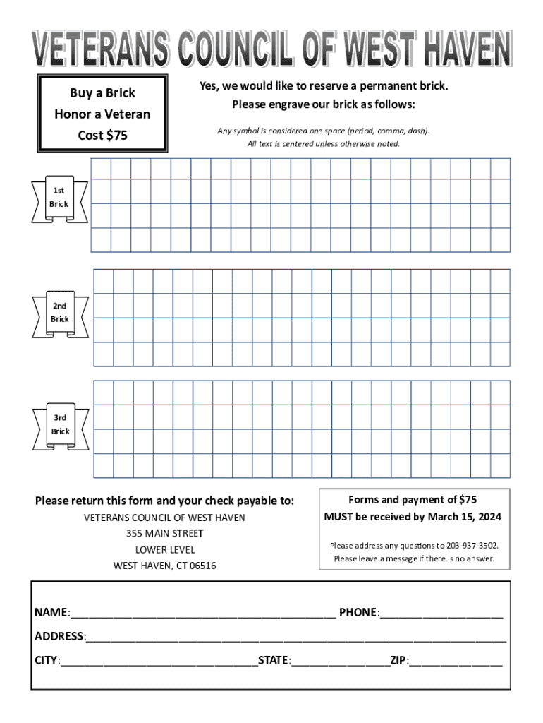 Before filling out the form, it’s crucial to gather your personal information. Typically, you will need to provide your name, address, and contact information. Additionally, specifics for brick engraving are essential — this includes the text you want inscribed and any preferences regarding font style or layout. Having this information ready ensures a smoother experience as you fill in your order.