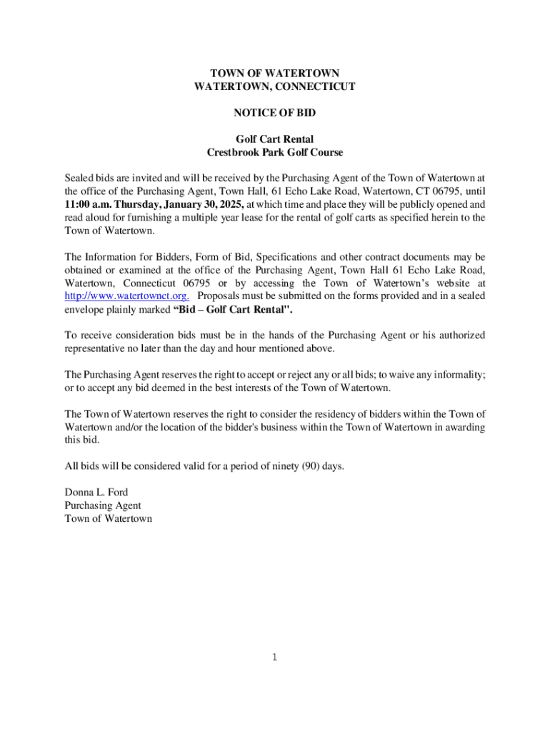 This document outlines the invitation for sealed bids for the rental of golf carts at Crestbrook Park Golf Course by the Town of Watertown, detailing submission requirements, specifications, and conditions