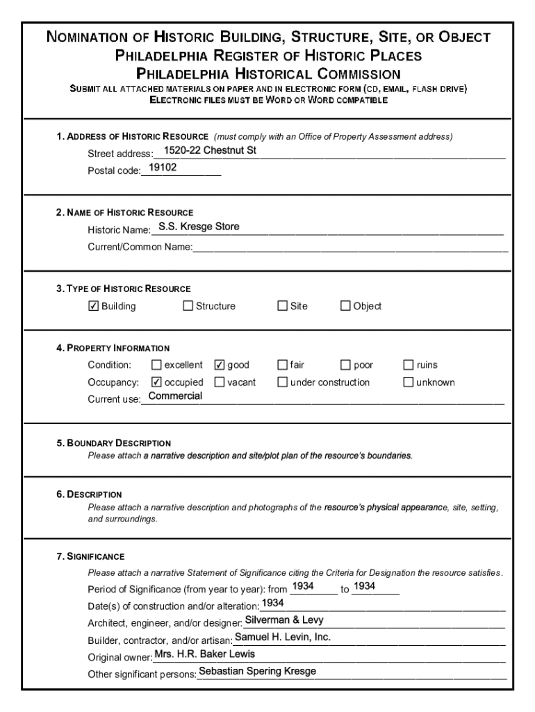 Get the free Nomination to the Philadelphia Register of Historic Places