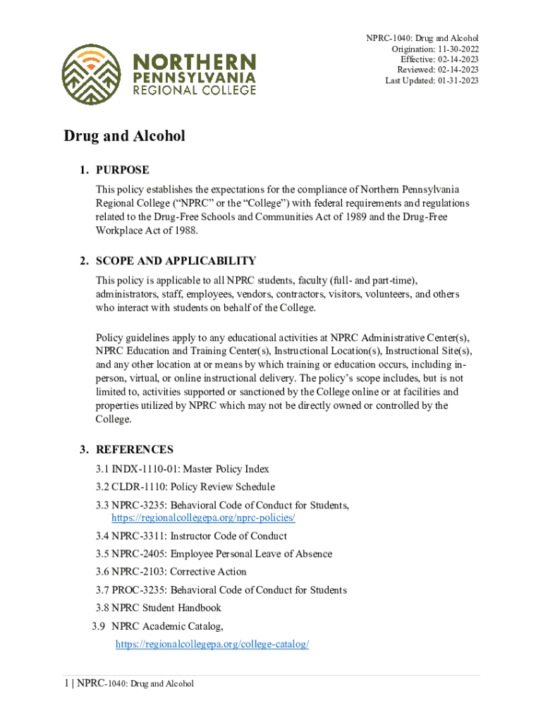 This document outlines the Northern Pennsylvania Regional College\'s compliance expectations regarding the Drug-Free Schools and Communities Act and the Drug-Free Workplace Act, detailing policies