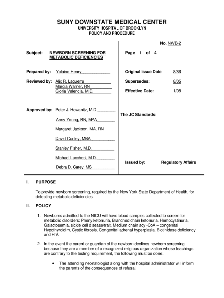 Get the free Newborn Screening for Metabolic Deficiencies