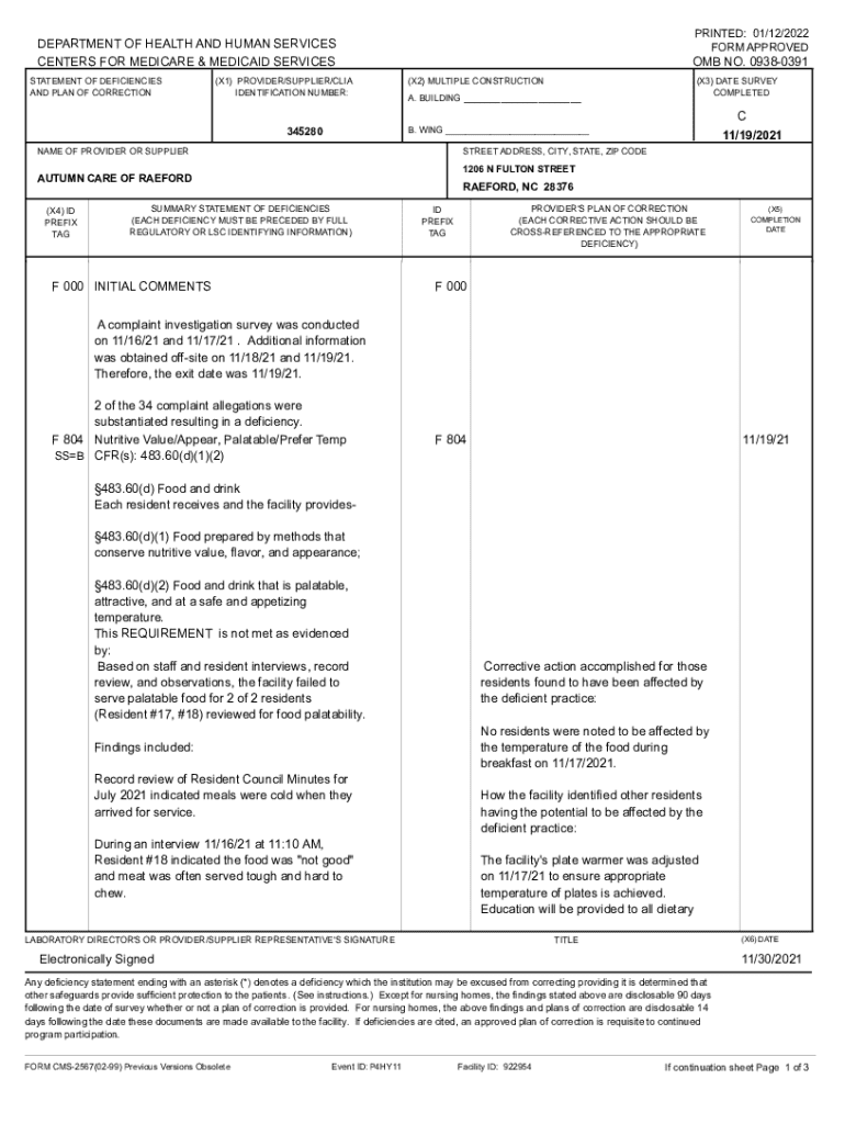 Get the free Statement of Deficiencies and Plan of Correction