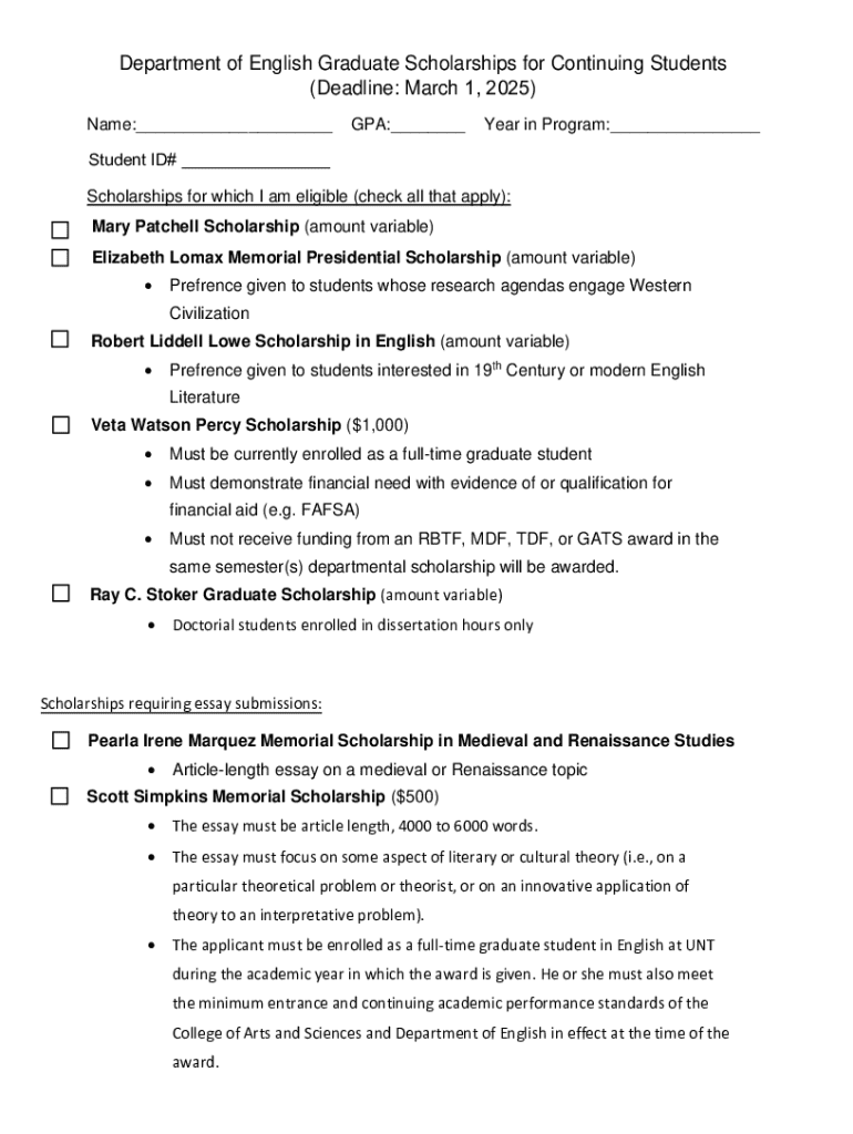 The graduate scholarship checklist is an essential tool for students aiming to secure funding for their advanced studies. Using a checklist allows candidates to organize their applications systematically, minimizing oversight and enhancing the quality of their submissions. By following each step outlined in your graduate scholarship checklist form, you ensure that you present a compelling case for why you deserve financial support.