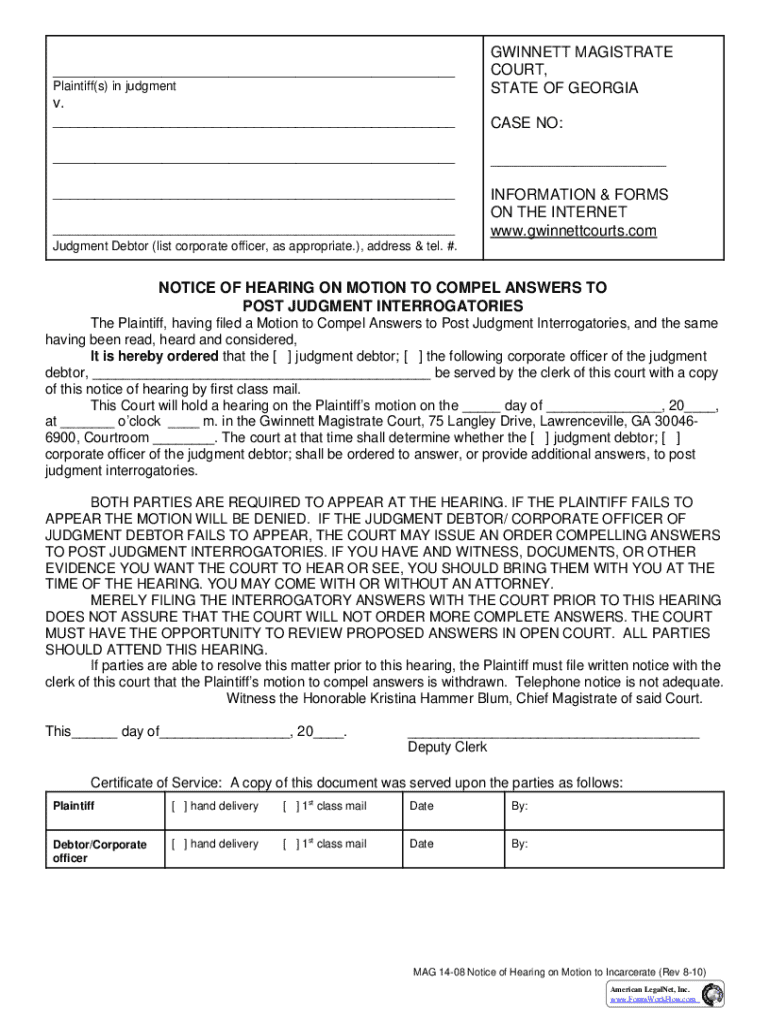 Get the free Notice of Hearing on Motion to Compel Answers to Post Judgment Interrogatories