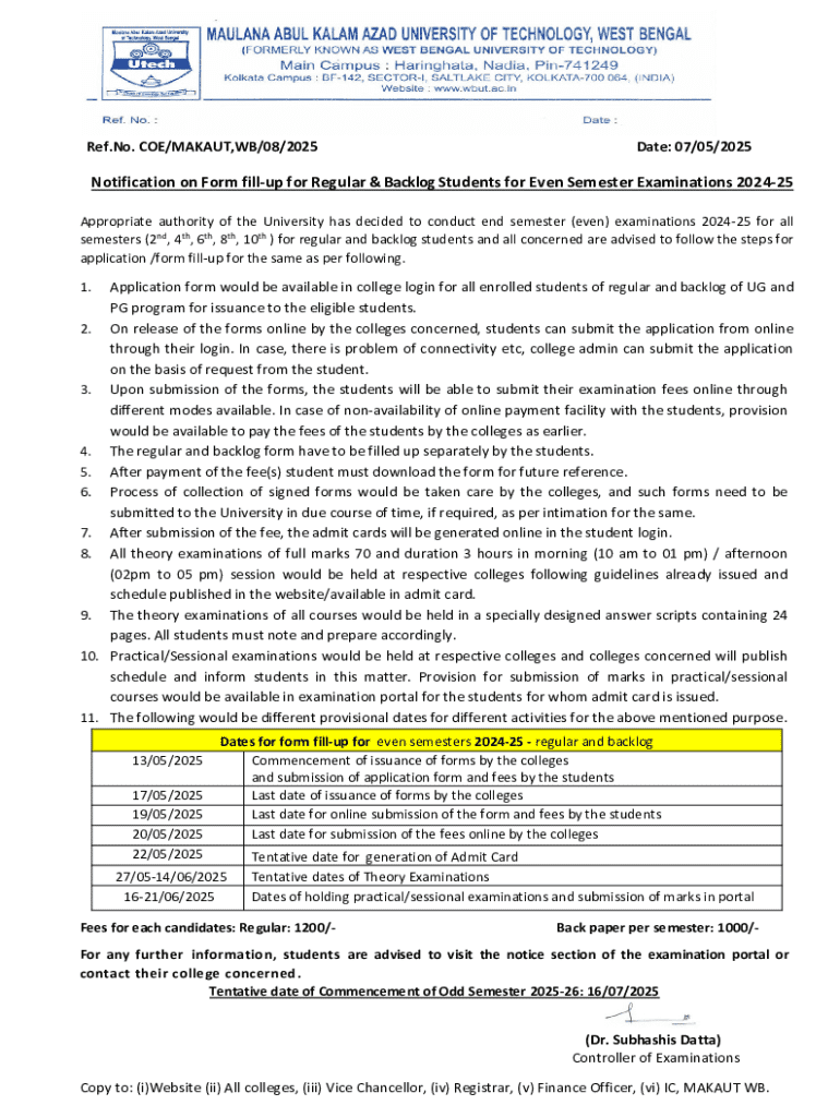 Get the free Notification on Form Fill-up for Regular & Backlog Students for Even Semester Examin...