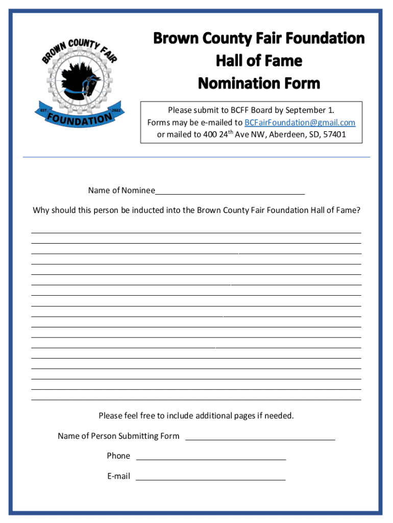 Get the free Brown County Fair Foundation Hall of Fame Nomination Form