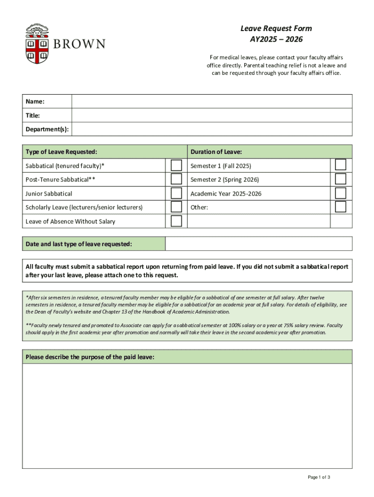 The leave request form AY2025 is a critical document for faculty and staff seeking time away from their duties. This form allows individuals to formally specify their reasons for absence, whether it be for personal matters, family commitments, or professional development pursuits. Its importance cannot be overstated as it ensures that both the institution and the individual are well-prepared for the transition during the leave period.