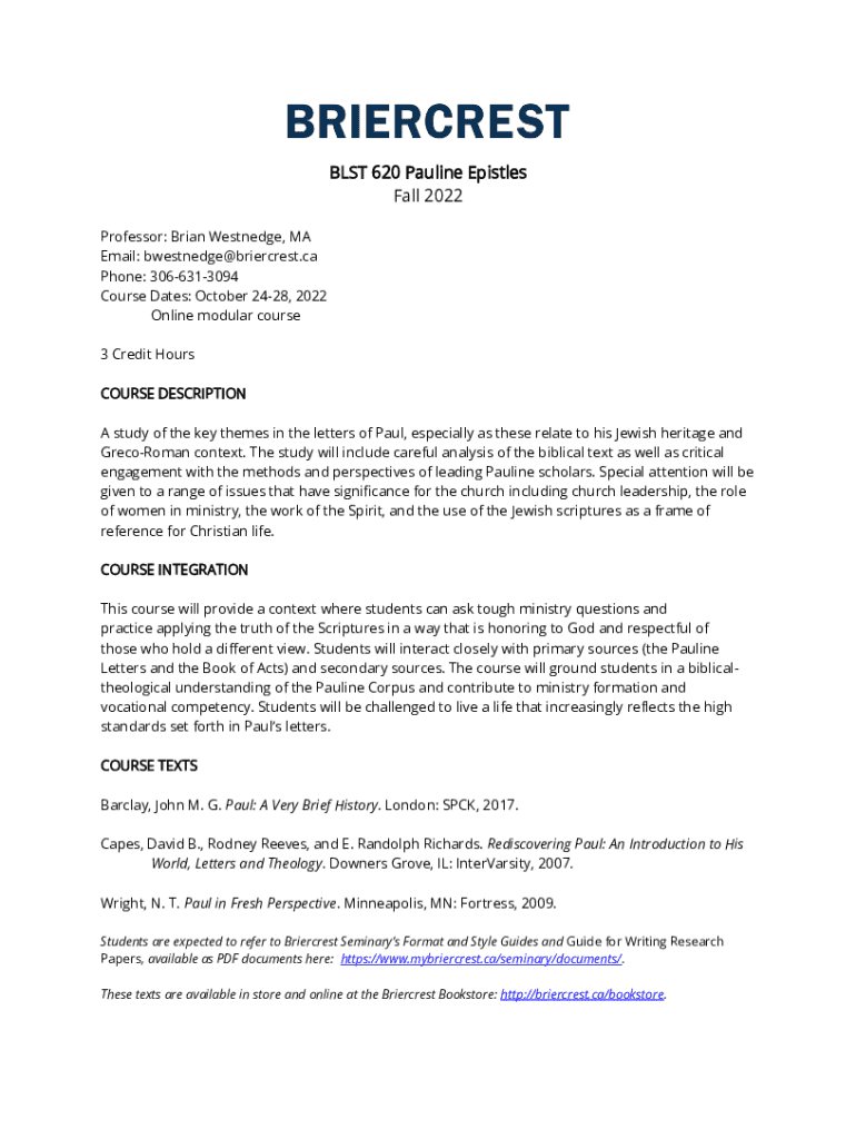 The BLST 620 form serves as a vital tool within the course, allowing students to compile their research and insights systematically. This form not only simplifies note-taking but also aids in organizing thoughts and reflections on the Pauline Epistles. It is designed to foster a structured approach to studying these complex texts effectively.