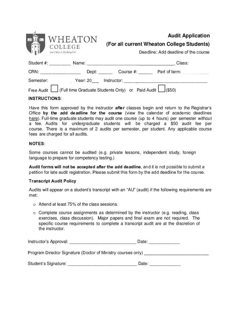 This form is for students at Wheaton College who wish to audit a course. It includes guidelines for approval and fee structure for auditing courses.