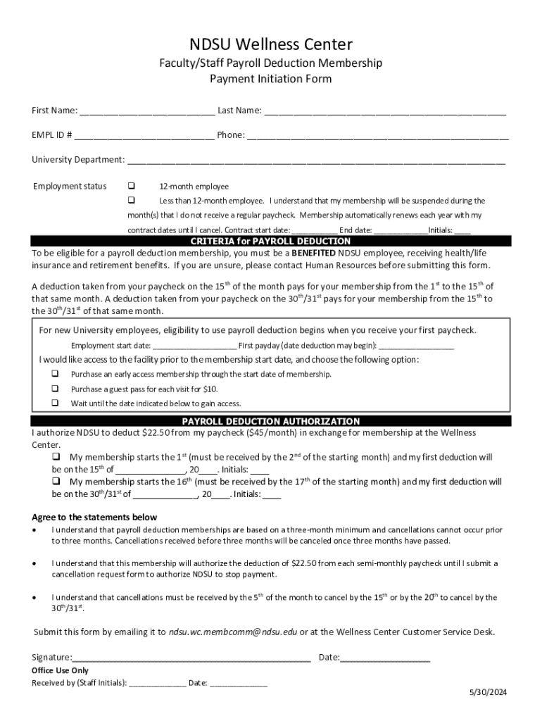 Get the free Ndsu Wellness Center Faculty/staff Payroll Deduction Membership Payment Initiation Form