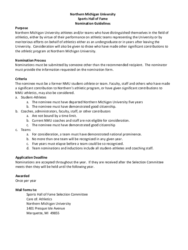 Get the free Northern Michigan University Sports Hall of Fame Nomination Guidelines