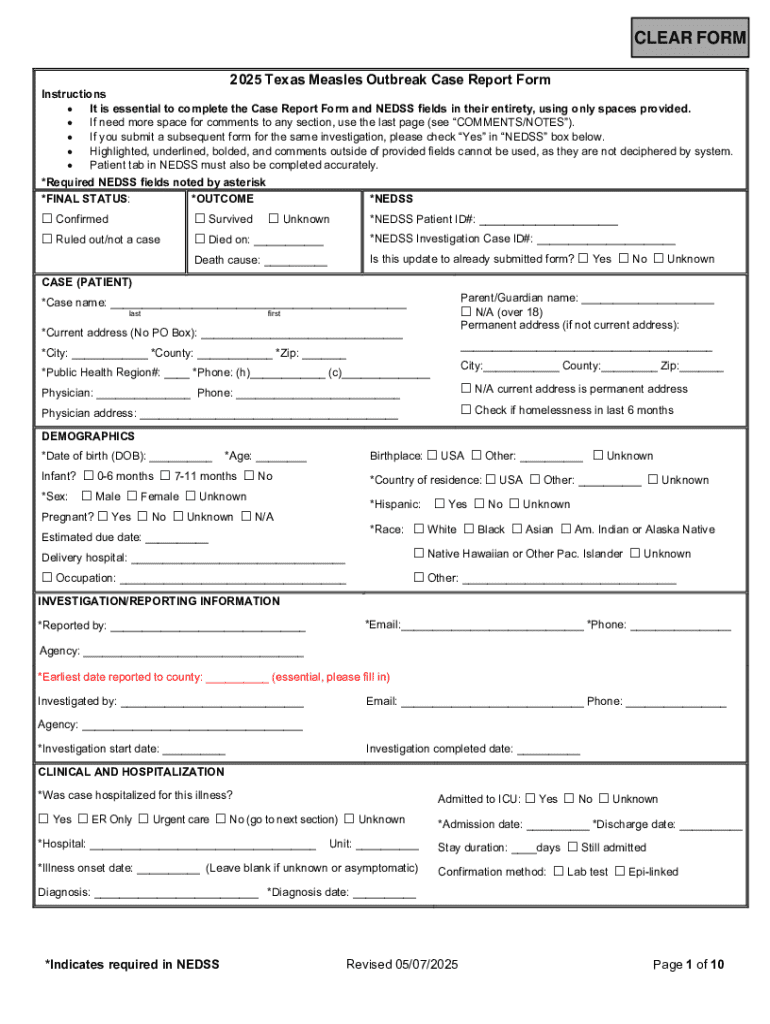 Get the free 2025 Texas Measles Outbreak Case Report Form