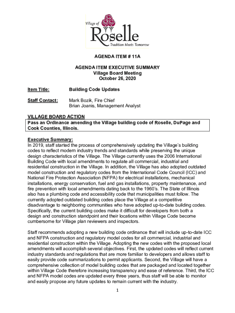 This document outlines the adoption of updated building codes for the Village of Roselle, reflecting modern standards and practices in construction. It includes specifics on various codes such as