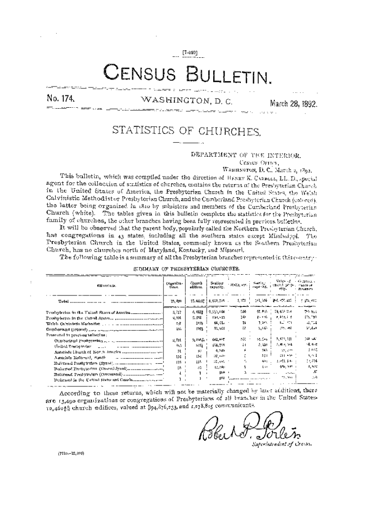 Get the free Bulletin 174. Statistics of Churches. PresbyterianPresbyterian in the United States ...